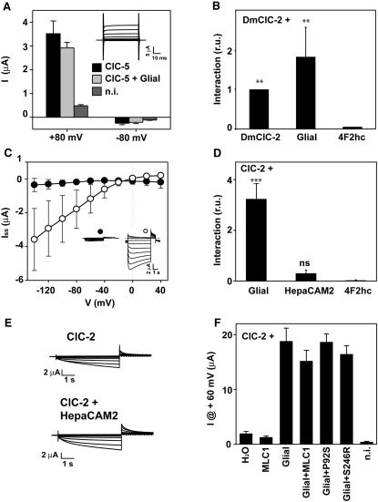 Figure 5. Specificity of the ClC-2 GlialCAM Interaction(A) Human ClC-5 was expressed in oocytes with and without GlialCAM. Currents were quantified at positive (+80 mV) and negative (−80 mV) voltages 3 days after injection. The inset shows representative ClC-5 + GlialCAM traces using a voltage-clamp protocol with pulses ranging from +120 mV to −120 mV in 20 mV steps.(B) Interaction between DmClC-2 and DmClC-2 or GlialCAM was monitored using split-TEV assays. 4F2hc was used as a negative control. The result is an average of 5 independent experiments. ∗∗p < 0.01 versus 4F2hc.(C) DmClC-2 was expressed in Xenopus oocytes by itself or together with GlialCAM. Two days after injection in oocytes DmClC-2 ± GlialCAM currents were determined. Steady state currents are plotted against voltage (n = 5 ± SEM). The inset shows representative current traces of DmClC-2 (filled circle) and DmClC-2 / GlialCAM (open circle).(D) Interaction between ClC-2 and GlialCAM or HepaCAM2 by split-TEV assays. 4F2hc was used as a negative control. The result is an average of 13 independent experiments. ∗∗∗p < 0.001; “ns” indicates no significant difference versus 4F2hc.(E) Typical ClC-2 currents in Xenopus oocytes expressed by itself (left) or coexpressed with HepaCAM2 (right). HepaCAM2 positive protein expression was assessed by Western blot (data not shown).(F) Currents measured in Xenopus oocytes at + 60 mV after the expression of ClC-2 alone (3 ng), ClC-2 (3 ng) + GlialCAM (5 ng), or ClC-2 (3 ng) + GlialCAM (5 ng) + wild-type MLC1 (3 ng) or containing the MLC-causing mutations P92S and S246R (3 ng). The result is a representative experiment of two experiments with at least 5 oocytes measured for each condition.