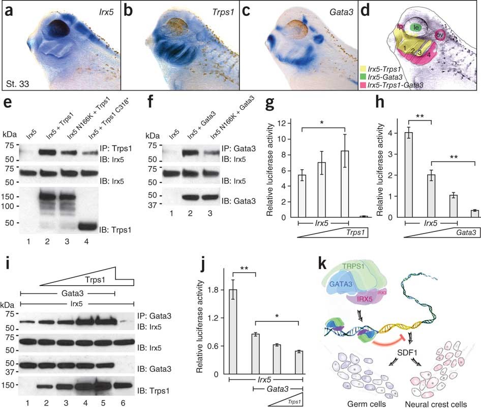 Figure 4: Irx5 interacts with zinc-finger transcription factors Gata3 and Trps1 to regulate craniofacial morphogenesis. a–c) Irx5 (a), Trps1 (b) and Gata3 (c) were expressed in nested regions of developing X. laevis head at stage (st.) 33. (d) Irx5, Trps1 and Gata3 transcripts (pink) colocalized to ventral region of four branchial arches (1–4), otic vesicle (ov) and frontonasal process (fp). Irx5 and Trps1 (yellow) were coexpressed in most anterior three branchial arches (1–3). Irx5 and Gata3 mRNA (green) were seen in developing lens (le). (e) Irx5 coimmunoprecipitated with wild-type Trps1 (lane 2), and to a lesser extent with the variant18 (lane 4). IP, immunoprecipitation; IB, immunoblot. Irx5 N166K protein was pulled down by wild-type Trps1 (lane 3). (f) Gata3 coimmunoprecipitated with wild-type Irx5 (lane 2), and to a lesser extent with mutant Irx5 N166K (lane 3). (g,h) Trps1 promoted Irx5-dependent transactivation of Kcnd2 promoter luciferase construct. Conversely, Gata3 inhibited Irx5-dependent transactivation of Kcnd2 reporter. Data are mean ± s.d. *P < 0.05; **P < 0.005; one-tailed Student's t test). (i) Increasing amounts of Trps1 dose-dependently enhanced binding of Gata3 to Irx5 (lanes 2–5). (j) Increasing amounts of Trps1 potentiated inhibitory role of Gata3 on Irx5-mediated transactivation of Kcnd2 reporter. Data are mean ± s.d. *P < 0.05; **P < 0.005 (one-tailed Student's t test). (k) Schematic of IRX5 and IRX3 proteins, in complex with comodulators TRPS1 and GATA3, tuning transcription of target genes such as SDF1 for chemoattraction of migratory populations of NCCs and germ cells.