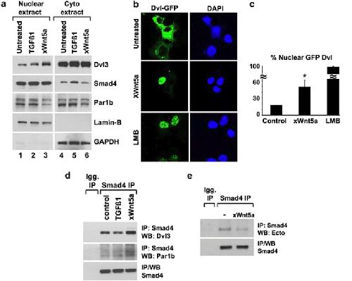 Figure 6. Wnt5a promotes nuclear Dvl/Par1b/Smad4 complex formation. (a) Monitoring endogenous Dvl3 and Par1b localization by nuclear-cytoplasmic fractionation of HEK293T cell lysates. The nuclear pool of Dvl3 was enhanced upon transfection of XWnt5a (100âng/cm2), whereas Par1b is distributed uniformly between the two compartments. LaminB and GAPDH serve as controls for nuclear and cytoplasmic fractionation. (b) Localization of Dvl-GFP (50âng/cm2) by fluorescence microscopy in HEK293T cells. Note that co-transfection XWnt5a (100âng/cm2) enhances nuclear localization of Dvl-GFP (green channel). Treatment with the nuclear export inhibitor leptomycinB was carried out at 50âng/ml for 4âh. Hoechst (blue channel) is a nuclear counterstain. (c) Quantification of cells displaying nuclear localization of Dvl-GFP shown in Figure 6b. Transfected cells were fixed and at least seven fields each containing 10â20 GFP-expressing cells were photographed and counted. LMB dramatically shifts Dvl localization into the nucleus (>95% of cells). Data represent mean and S.D. of two independent experiments. Percentage of nuclear positive Dvl-GFP cells. (d) Endogenous Smad4 interacts with Par1b and Dvl3 from nuclear fractions of HEK293T cells. Wnt5a stimulation increases these nuclear complexes. (e) Endogenous Smad4/Ecto complexes are inhibited in Wnt5a-stimulated HEK293T cells |