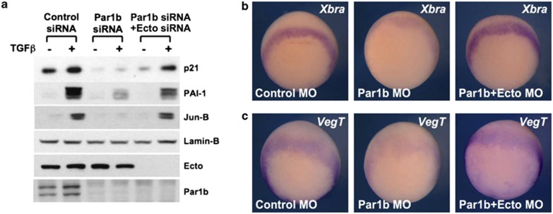 Figure 7. Ectodermin/Tif1γ is epistatic to Par1b for regulation of TGFβ signaling. (a) Immunoblots for p21Waf1, JunB and PAI1, whose induction by TGFβ is inhibited by Par1b depletion but rescued by dual depletion of Par1b and Ecto. LaminB serves as loading control. (b and c) Panels show in situ hybridization of Xenopus embryos injected at the four-cell stage in the marginal zone with control MO (140âng), Par1b MO (x+y, 80âng total) alone or in combination with Ecto MO 29 (60âng). Embryos were stained for Xbra and VegT. Note that Ecto depletion rescues gene expression in Par1b-depleted embryos (n=22, 77% and n=21, 67%) |