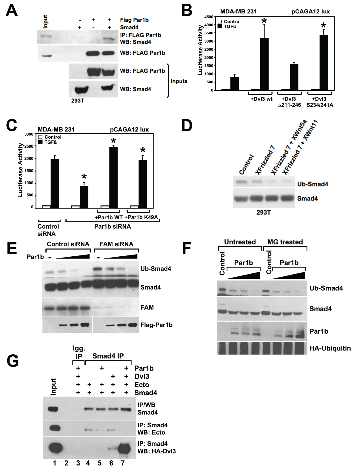 Crosstalk of signaling pathways is critical during metazoan development and adult tissue homeostasis. Even though the transforming growth factor-beta (TGFβ) transduction cascade is rather simple, in vivo responsiveness to TGFβ ligands is tightly regulated at several steps. As such, TGFβ represents a paradigm for how the activity of one signaling system is modulated by others. Here, we report an unsuspected regulatory step involving Dishevelled (Dvl) and Par1b (also known as MARK2). Dvl and Par1b cooperate to enable TGFβ/bone morphogenetic protein (BMP) signaling in Xenopus mesoderm development and TGFβ responsiveness in mammalian cells. Mechanistically, the assembly of the Par1b/Dvl3/Smad4 complex is fostered by Wnt5a. The association of Smad4 to Dvl/Par1 prevents its inhibitory ubiquitination by ectodermin (also known as transcriptional intermediary factor 1 gamma or tripartite motif protein 33). We propose that this crosstalk is relevant to coordinate TGFβ responses with Wnt-noncanonical and polarity pathways.