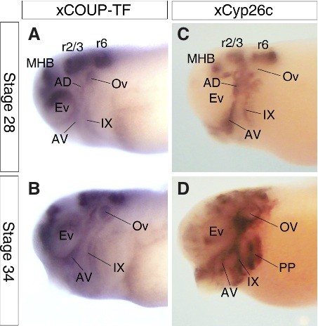 Fig. 4. Comparison of xCOUP-TF-B and xCyp26C expression in brain region of tadpole. (A-D) Whole mount in situ hybridization was carried out with COUP-TF-B (A,B) and xCyp26C (C,D) probe. We observed Stage 28 (A,C) or Stage 34 (B,D) embryo. MHB: midbrain-hindbrain boundary. AD: anterodorsal lateral line pracode. AV: anteroventral lateral line pracode. Ev: eye vesicle. Ov: otic vesicle. IX: Epibranchial IX placode. PP: pharyngeal pouch. R2/3: rhombomere 2/3. R6: rhombomere 6.