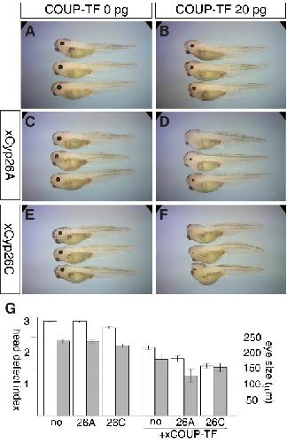 Fig. 5. Co-injection of xCOUP-TF-B enhanced the head defect pheno- type induced by ectopic expression of xCyp26A or xCyp26C. (A-F) 500 pg of xCyp26A (C, D) or 500 pg of xCyp26C (E, F) was co-injected with xCOUP-TF-B (D, F), and injected embryos were observed at stage 40. (G) The open graph bar indicates head defect index (left column; Michiue et al., 2004) and gray bar indicates average eye size of injected embryo (right column). 26A and 26C indicates xCyp26A and xCyp26C, respectively. Error bar indicates S.E.