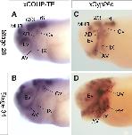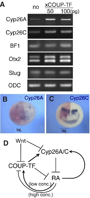 Fig. 6. xCOUP-TF-B enhanced transcription of both xCyp26A and xCyp26C. (A) RT-PCR was performed with stage-13 embryos injected with 50 pg (lane 2) or 100 pg (lane 3) of xCOUP-TF-B. We observed gene expression of Cyp26A (column 1), Cyp26C (column 2), XBF-1 telencephalon marker: column 3), Xotx2 (forebrain marker: column 4), xSlug (neural crest marker: column 5), and ODC (quantitative control: column 6). (B,C) Whole mount in situ hybridization of embryos injected with 75 pg of xCOUP-TF-B with xCyp26A (B,B or xCyp26C (C,C.The injection side was marked with Red-Gal. (D) Schematic model of xCOUP-TF function.