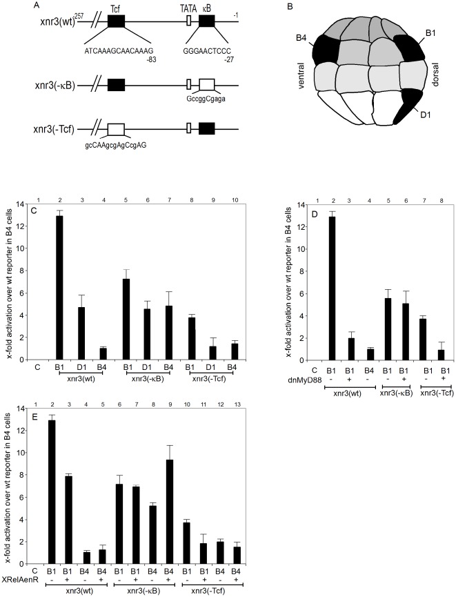 Figure 5. The Xnr3 promoter is regulated through a consensus NF-κB DNA binding site.Panel (A) - Pictorial representation of the Xnr3 promoter and its κB and Tcf binding sites, as well as representations of mutated promoters, which were used in the luciferase reporter gene assays. Bases at mutated nucleotide positions are shown in lower-case letters. (B) Lateral schematic view of a 32-cell stage embryo locating the B1, B4 and D1 blastomeres in black, whose progeny will later contribute to the BCNE, the ventral gastrula center (VGC) and the Nieuwkoop center (NC), respectively. (C) Results of injection of a group of wildtype and mutant Xnr3 promoter driven luciferase constructs, each injected into the B1, B4 and D1 blastomeres of 32-cell stage embryos; y-axis describes x-fold production of luciferase, normalized to an internal renilla control, relative to the luciferase activity of uninjected embryos (lane 1). (D) and (E) Luciferase activities of wildtype and mutant Xnr3 reporter constructs, injected into B1 or B4 blastomeres as indicated, under conditions, in which endogenous NF-κB activity is either antagonized through coninjected XrelAenR (D) or reduced through dominant-negative XMyD88 (E). Luciferase activity was measured at midgastrula (NF11). |