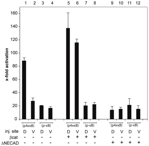 Figure 7. A synthetic NF-κB reporter gene is coactivated by β-Catenin.Luciferase activity at midgastrula (NF11) produced by injection of the reporter constructs pNF-κB+ (containing 4 κB binding sites) and pNF-κBâ (containing none) into both blastomeres of either the dorsal or ventral side of 4-cell stage embryos. β-Catenin (25 pg; lanes 5â8) and E-cadÎE (50 pg; lanes 9â12) RNAs were co-injected with the reporter. Y-axis shows x-fold stimulation of luciferase activity over uninjected controls after normalization to the internal Renilla control. |