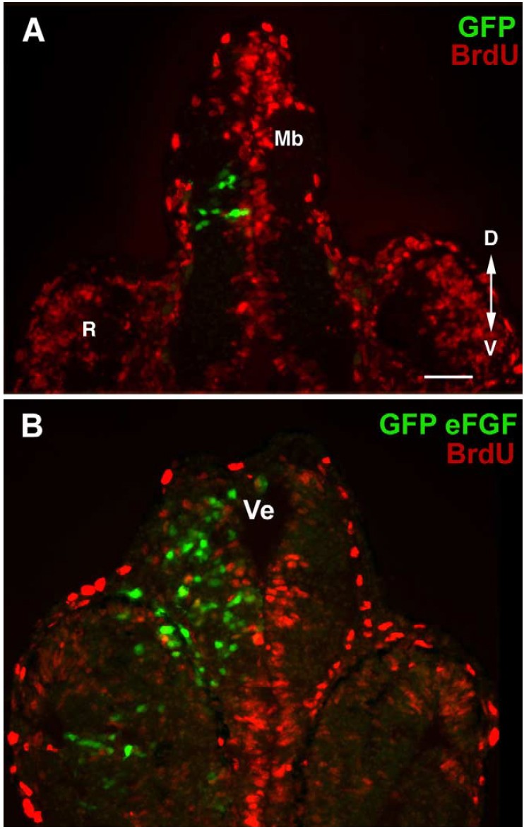 neuroepithelial cells misexpressing GFP (A), or GFP and eFGF (B), were