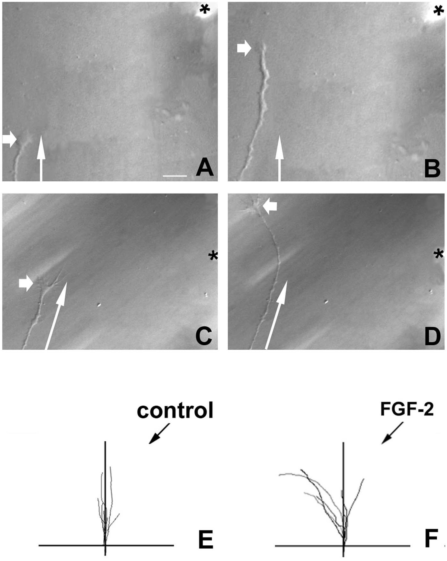 examples of the behavior of HRP-labeled RGC axons (red) encountering either GFP (A–B), or GFP and eFGF (C–F) plasmid-expressing brain cells (green).
