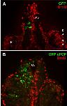 40 Xenopus brains transfected with GFP (A) or FGF-2 (B) plasmid at stage 24. HRP-labeled optic projections ignore GFP-misexpressing cells (arrowhead