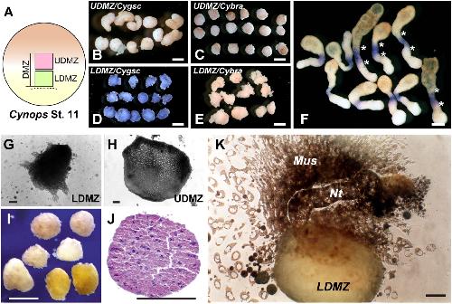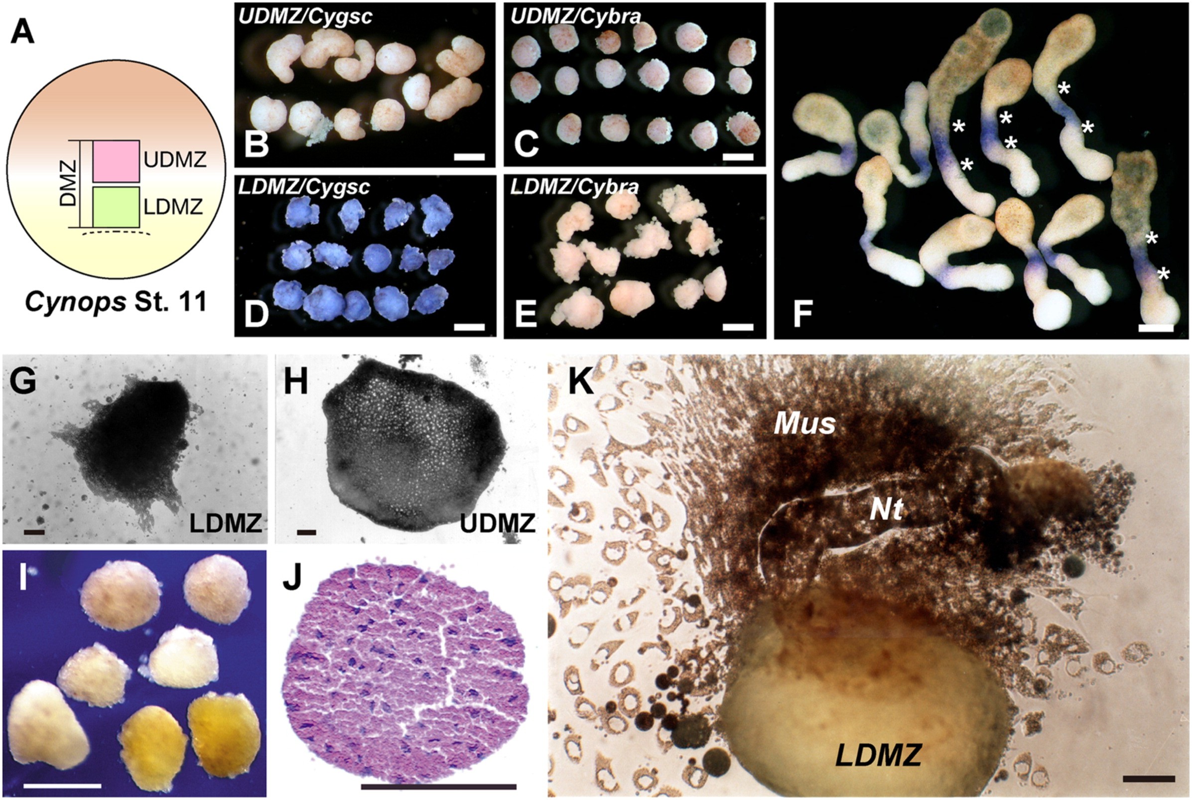 Fig. 8. Gene expression, self-differentiation and notochord-inducing activity of the dorsal marginal zone (DMZ) of the early gastrula of Cynops. (A) The early gastrula (stage 11) DMZ of Cynops is divided into two domains of UDMZ (future trunkail notochord) and LDMZ (future pharyngeal endoderm/prechordal plate). (B) The UDMZ and LDMZ are separately isolated and Cygsc and Cybra expressions analyzed. The UDMZ express neither Cygsc nor Cybra at stage 11 (B, C). The expression is unchanged when isolated UDMZ is cultured in vitro for 24 h. LDMZ expresses Cygsc but not Cybra (D, E). When the LDMZ is isolated and cultured in vitro for 24 h, Cygsc expression is maintained. (F) Keller sandwich of early gastrulaDMZ. The early gastrulaDMZ was isolated and cultured in the Keller sandwiches for 24 h at 20 until the control embryo developed to the late gastrula (stage 13b/c). Cybra expression was planarly induced in the UDMZ part of the explants. Approximate position of the UDMZ is marked by asterisks (B reproduced from Kaneda et al., 2009.); (G, I, J) Self-differentiation of the LDMZ in the isolation culture. LDMZ differentiates to an endodermal cell mass. Any mesodermal or ectodermal tissues are differentiated. (I and J reproduced with permission from Sakaguchi et al., 2002, Int. J. Dev. Biol., 46, 79300). (H) UDMZ self-differentiates to epidermis. (K) When the LDMZ is combined with a small piece of animal cap ectoderm, the animal cap ectoderm is induced to notochord (Nt) and muscle cells (Mus), while LDMZ itself differentiates into a mass of endodermal cells.