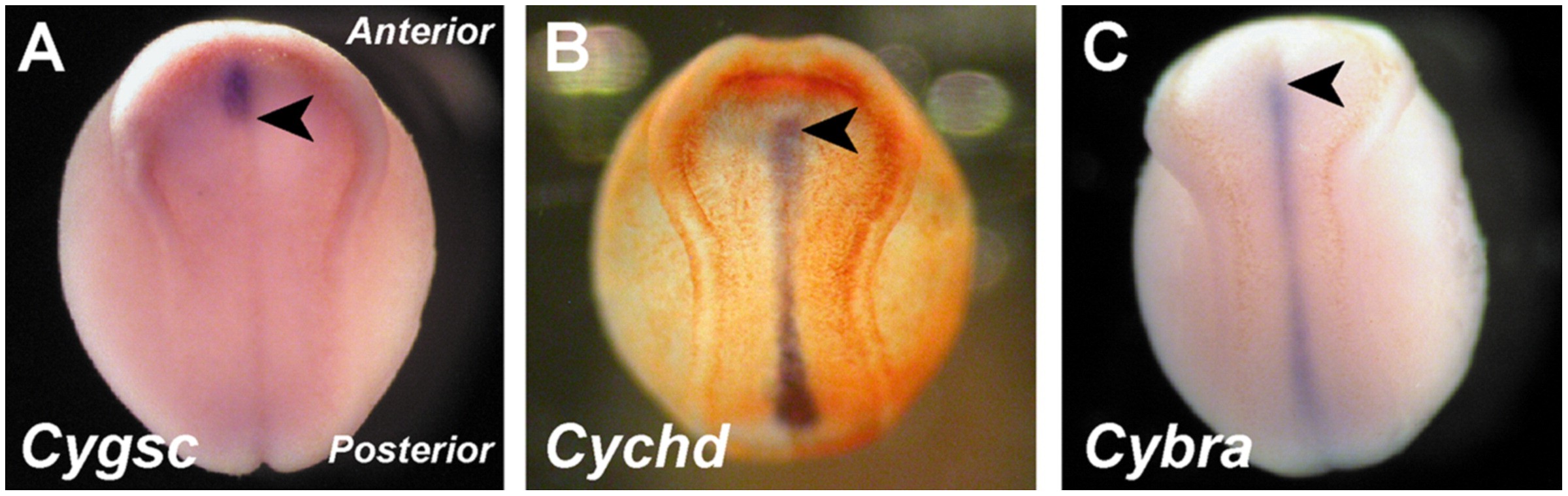 Fig. 6. Gene expression patterns at the neurula stage of Cynops. (A) Cygsc, (B) Cychd and (C) Cybra expression at the neurula stage (stage 18) of Cynops. Cygsc expression is restricted to the fore-notochordal endodermal roof (FNE), just anterior to the notochord. Cychd and Cybra expressions are restricted to the entire notochord. Arrowhead indicates the anterior end of the notochord. (A and C from Kaneda et al., 2009; B is from Motoki et al., unpublished.).