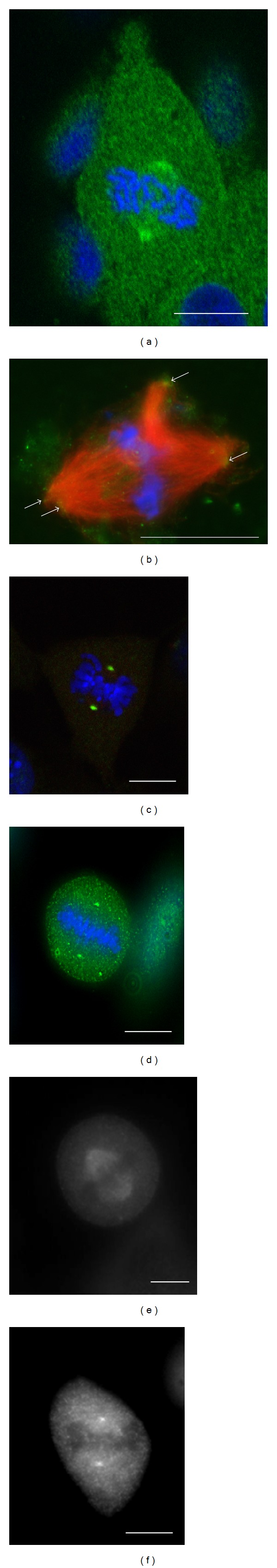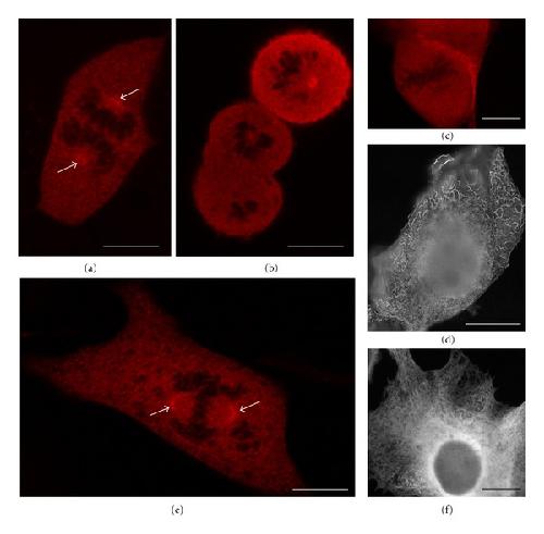 Figure 2. Expression of Myc-XlTCTP in Xenopus laevis XL2 cells. (a) Confocal section of XL2 cell in anaphase with high concentration of XlTCTP at the spindle poles (white arrows). (b) Confocal section of two dividing XL2 cells with high concentration of XlTCTP at the spindle poles. (c) Control mitotic XL2 cells expressing Myc tag only. (d) Interphase XL2 cell expressing Myc-XlTCTP. XLTCTP is localized in distinct fibers in the cytoplasm. (e) Mitotic murine NIHT3T cell expressing Myc-XlTCTP. High concentration of XlTCTP is present at the spindle poles (white arrows). (f) Interphase murine NIH3T3 cells expressing Myc-XlTCTP. Note that XlTCTP forms MT-like fibers in the cytoplasm. Bar is equal to 20 μm.