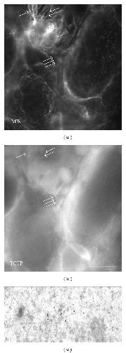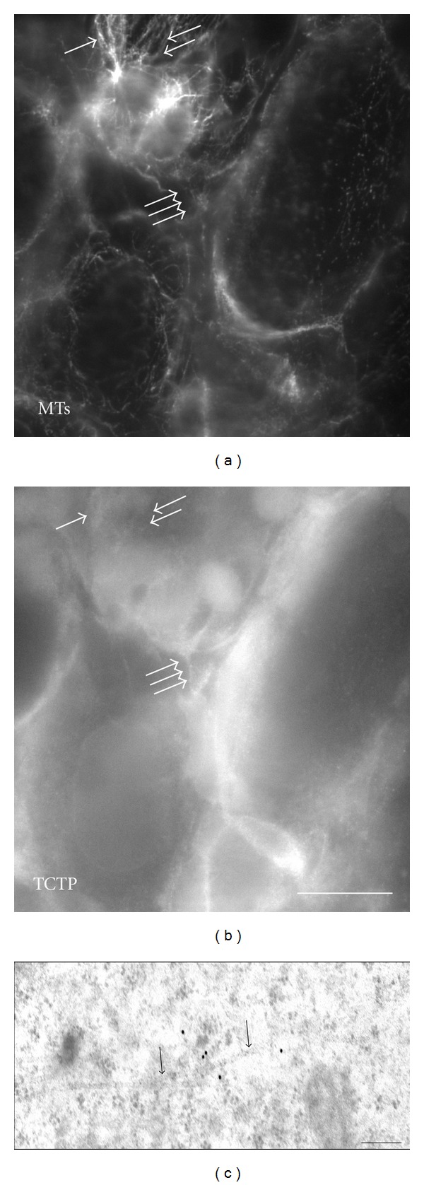 Figure 4. MTs and TCTP in Xenopus laevis tadpoleovary. Interphase cells. Upper panel, left: β-tubulin, right: TCTP localization. Anti-XlTCTP was used for this localization. Single white arrow points to cellular structures positive both for β-tubulin and TCTP. Double arrows point to β-tubulin-positive and TCTP-negative fibers. Triple arrows point to TCTP-positive and β-tubulin-negative fibers. Bar is equal to 20âμm; Bottom panel: electron microscopy gold immunolabeling of TCTP (black particles in the center) in the vicinity of MTs (black arrows). Bar is equal to 100ânm.