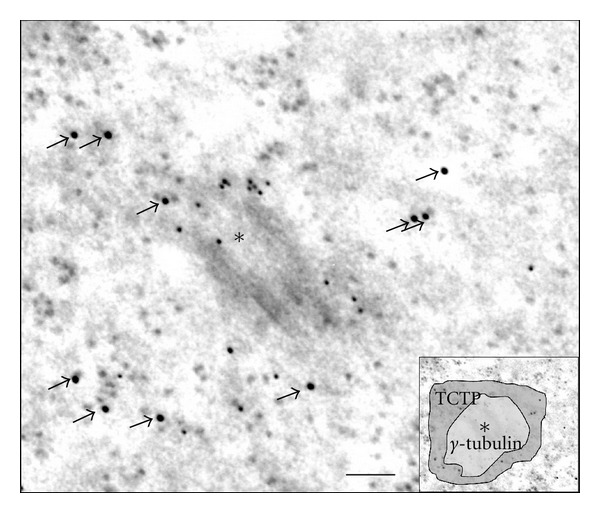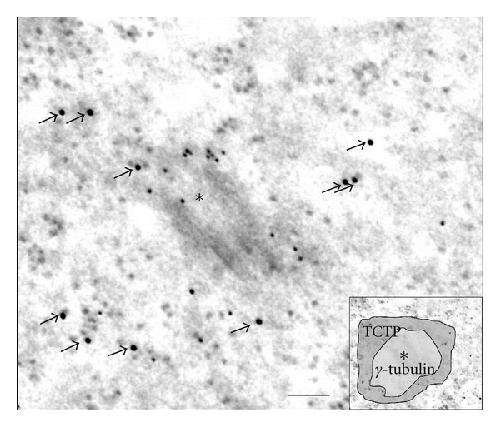 Figure 6. Double labeling of γ-tubulin and TCTP in the centrosome of Xenopus laevis oogonium. Centriole labeled with black asterisk; 18 nm gold particles (black arrows) correspond to the presence of TCTP, small, and 10 nm gold particles around the centriole mark the presence of γ-tubulin. Inset in the bottom right corner shows the central area around the centriole where γ-tubulin is present (clear central area), and the TCTP-containing external area of the centrosome (dark grey). Bar is equal to 100 nm.