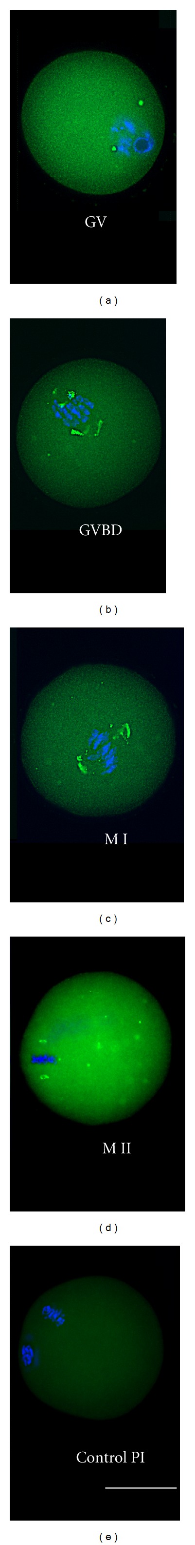 Figure 3. Immunofluorescence localization of TCTP with anti-XlTCTP antibody in mouse maturing oocytes. GV: prophase I-arrested oocyte, GVBD: the beginning of maturation, MI and MII: oocytes in MI and MII phase of meiosis, respectively, control PI: control MII oocyte stained with the preimmune serum. XlTCTP antibody stains PCM in all stages of maturing mouse oocytes. DNA (blue) stained with DAPI. Bar is equal to 40 μm.
