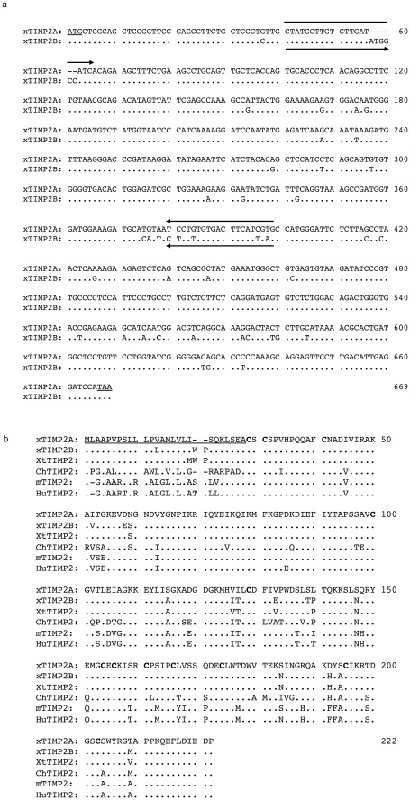Figure 1. There are two X. laevis TIMP2 genes that are highly homologous to the TIMP2 gene in other vertebrates.A) Nucleotide sequence comparison of X. laevis TIMP2A and TIMP2B. Dot (.): identical sequence; dash (-):a gap introduced for better alignment. Arrowed lines indicate the locations of the primers used to distinguish the two isoforms in RT-PCR analysis. B) Comparison of the protein sequences of putative X. laevis TIMP2A (XlTIMP2A, AAH74452), X. laevis TIMP2B (XlTIMP2B, NP_001087748), and X. tropicalis TIMP2 (XtTIMP2, NP_001015760) with their ortholog from chick (ChTIMP2, NP_989629), mouse (mTIMP2, P25785) and human (HuTIMP2, NP_003246). The conserved cysteine sequences are in bold and the signal peptide sequence is underlined. Dot (.): identical sequence; dash (-): a gap introduced for better alignment.