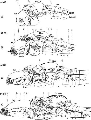 Figure 1. Schematic representation of the general distribution of calbindin (empty dots) and calretinin (filled dots) immunoreactive cells in a sagittal views of the brain at representative early embryonic (a) late embryonic (b) premetamorphic (c) and prometamorphic (d) stages. In all schemes dorsal is oriented upward and rostral to the left. The main subdivisions with regard to the neuromeric models are indicated. In each scheme the dashed lines represent the levels of the sections shown in the microphotographs in subsequent figures. Levels indicated in a and b correspond to photographs in Figure 2, levels indicated in c correspond to photographs in Figure 3, and levels indicated in d correspond to photographs in Figure 4. For abbreviations, see list. |