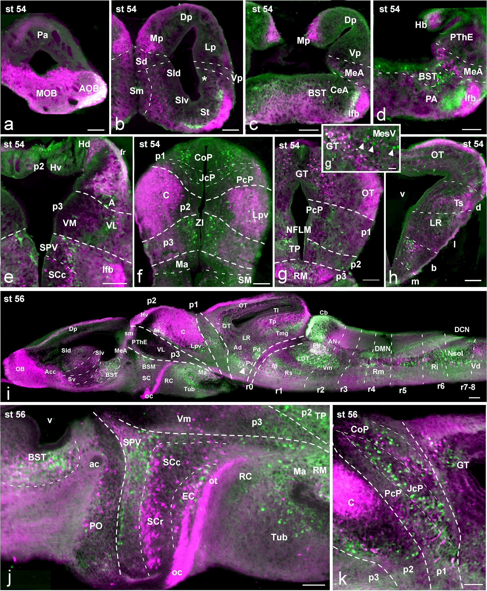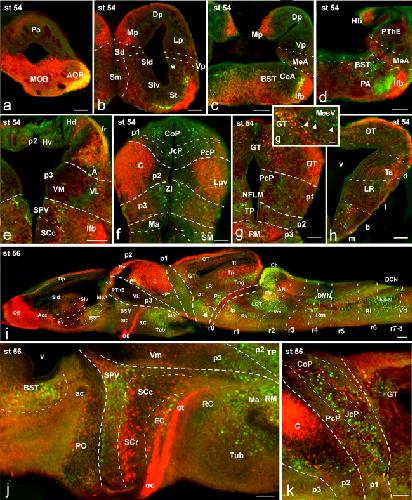 Figure 4. Photomicrographs of double-labeled CB/CR transverse (a) and sagittal (i; dorsal is upwards and rostral to the left) sections through representative levels of the brain of Xenopus at prometamorphic stages (indicated on each photomicrograph). The levels of transverse sections are indicated in Figure 1d. In all photographs green is CB and red is CR, whereas yellow represents double-labeled cells. Dashed lines represent the approximate boundary between telencephalic (a,i), diencephalic (e,i), mesencephalic (g,h), and rhombencephalic (i) subdivisions. i: Low magnification image of a lateral sagittal section showing the relationship between CB and CR labeled structures throughout the brain of a prometamorphic larva. j,k: Details of sagittal sections through the hypothalamic (j) and pretectal (k) region showing the relative localization of CB- and CR-labeled structures in each subdivision. Inset in g′ shows trigeminal mesencephalic neurons (arrowheads) in the rostral optic tectum. For abbreviations, see list. A magenta-green version of this figure is provided as Supporting Information Figure 3. Scale bars = 100 μm in a,k; 200 μm in i,j. |