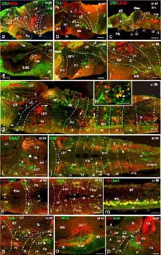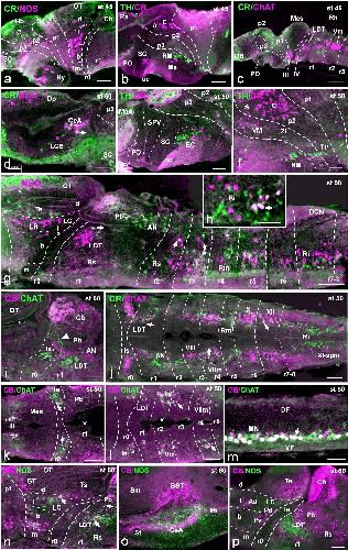 Supporting Figure 4 (Magentahyphen;green version of Figure 5 for the assistance of colorhyphen;blind readers): Photomicrographs of doublehyphen;labeled sagittal (ahyphen;i; dorsal is upwards and rostral to the left) and horizontal (j; rostral is to the left) sections through the brain of Xenopus at different developmental stages showing the distribution of CB or CR immunoreactive cells with nitric oxide synthase (NOS), tyrosine hydroxylase (TH) or choline acelyltransferase (ChAT). The markers shown in each panel are indicated in apriate color code, and the developmental stage is indicated in the upper rigth corner. ahyphen;c: relative localization of nitrergic (a) catecholaminergic (b) and cholinergic (c) populations compared to CR at stage 45. d: Colocalization of CR in the large niterergic cells of the central amygdala (double labeled cells in yellow). e: Distribution of CR in relation to the catecholaminergic cells in the preoptic and suprachiasmatic regions. f: Segmental distribution of the alar CRir cell groups in relation to the basal catecholaminergic cell groups, g: CRir and NOSir cells in the distinct dorsal and lateral bands in the mesencephalon, and along the rhombencephalon. h: High magnification of double CR/NOS labeled cells in the inferior reticular nucleus. i: CBir cells in the alar region of r0 and r1 in relation to the cholinergic nuclei. Arrowhead points to the fibers of the troclear nucleus in the basal plate (not shown). j: Horizontal section showing the relative position and the segmental arrangement of CR groups in relation to the ChATir motor and nonhyphen;motor cholinergic groups in the rhombencephalon. khyphen;m: Relative localization CBir cells in relation to the oculomotor, isthmic, rhombencephalic and spinal cholinergic cell groups. Doublehyphen;labeled cells always appear in yellow. nhyphen;p: CB and NOShyphen;stained structures in a premetamorphic larva in the mesencephalon and rostral rhombencephalon (n) and in prometamorphic larvae in the caudal telencephalon (o) and mesencephalon and rostral rhombencephalon (p). Double labeled CB/NOSir cells (in yellow) in the basal band of the mesencephalon and in the LDT at stage 50 were not observed at stage 60. For abbreviations, see list. Arrows point to doble labeled cells. A magentahyphen;green version of this figure is provided as Supporting Information Figure 4. Scale bar = 50 μm in a,b,dhyphen;f,h, khyphen;p; 100 μm in c,g, i,j. |
