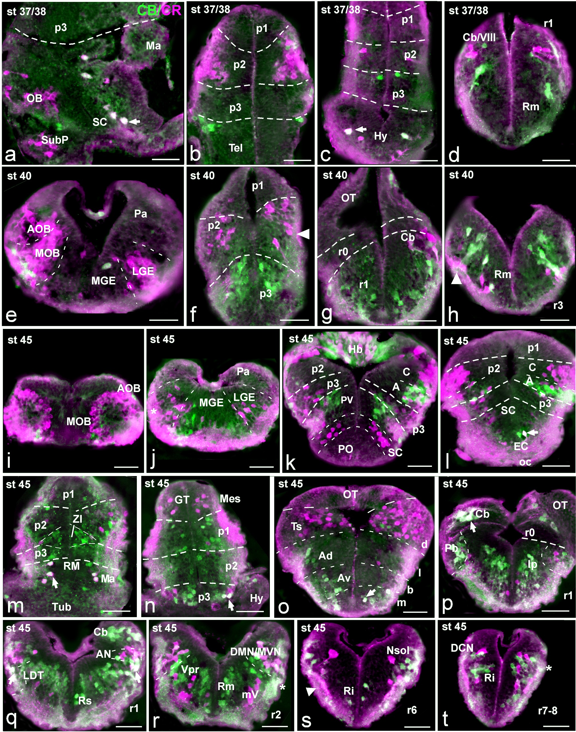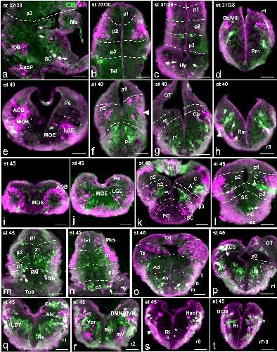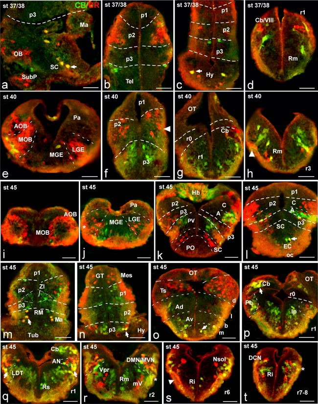 Figure 2. Photomicrographs of double-labeled CB/CR sagittal (a, dorsal is upwards and rostral to the left) and transverse (b) sections through representative levels of the brain of Xenopus at embryonic stages (indicated on each photomicrograph). The levels of transverse sections are indicated in Figure 1a,b. In all photographs green is CB and red is CR, whereas yellow represents double-labeled cells. Dashed lines mark the approximate boundary between neuromeres and telencephalic subdivisions. Arrowheads in f point to the lateral CRir fiber tract in p2, in hours, and in s point to the lateral CRir fiber tract in the basal plate, and in q to double-labeled cells in the LDT. The asterisks in r and t mark the CBir fibers in the lateral rhombencephalon. For abbreviations, see list. A magenta-green version of this figure is provided as Supporting Information Figure 1. Scale bars = 50 μm in a; 100 μm in i. |