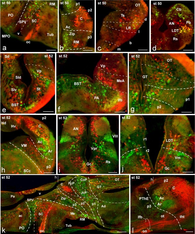 Figure 3. Photomicrographs of double-labeled CB/CR sagittal (a,k,l; dorsal is upwards and rostral to the left) and transverse (b) sections through representative levels of the brain of Xenopus at premetamorphic stages (indicated on each photomicrograph). The levels of transverse sections for stage 50, and the area shown in a, are indicated in Figure 1c. In all photographs green is CB and red is CR, whereas yellow represents double-labeled cells. Dashed lines represent the approximate boundary between telencephalic (e,f) or diencephalic (a,b,h,k,l) subdivisions, the mesencephalic longitudinal bands (c,g,k), and rhombencephalic regions (d,i,j). For abbreviations, see list. A magenta-green version of this figure is provided as Supporting Information Figure 2. Scales bar = 100 μm in a,l; 200 μm in k. |