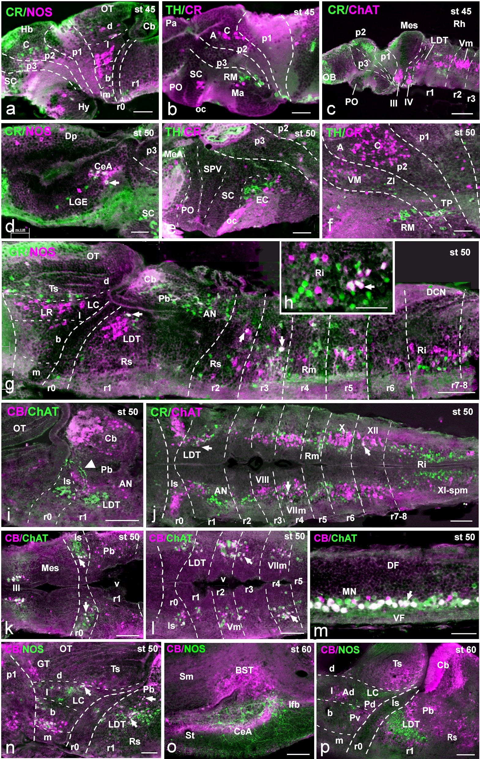Figure 5. Photomicrographs of double-labeled sagittal (a; dorsal is upwards and rostral to the left) and horizontal (j; rostral is to the left) sections through the brain of Xenopus at different developmental stages showing the distribution of CB or CR immunoreactive cells with nitric oxide synthase (NOS), tyrosine hydroxylase (TH), or choline acetyltransferase (ChAT). The markers shown in each panel are indicated in appropriate color code, and the developmental stage is indicated in the upper right corner. a: Relative localization of nitrergic (a) catecholaminergic (b) and cholinergic (c) populations compared to CR at stage 45. d: Colocalization of CR in the large nitrergic cells of the central amygdala (double-labeled cells in yellow). e: Distribution of CR in relation to the catecholaminergic cells in the preoptic and suprachiasmatic regions. f: Segmental distribution of the alar CRir cell groups in relation to the basal catecholaminergic cell groups, g: CRir and NOSir cells in the distinct dorsal and lateral bands in the mesencephalon and along the rhombencephalon. h: High magnification of double CR/NOS-labeled cells in the inferior reticular nucleus. i: CBir cells in the alar region of r0 and r1 in relation to the cholinergic nuclei. Arrowhead points to the fibers of the trochlear nucleus in the basal plate (not shown). j: Horizontal section showing the relative position and the segmental arrangement of CR groups in relation to the ChATir motor and nonmotor cholinergic groups in the rhombencephalon. k: Relative localization CBir cells in relation to the oculomotor, isthmic, rhombencephalic, and spinal cholinergic cell groups. Double-labeled cells always appear in yellow. n: CB and NOS-stained structures in a premetamorphic larva in the mesencephalon and rostral rhombencephalon (n) and in prometamorphic larvae in the caudal telencephalon (o) and mesencephalon and rostral rhombencephalon (p). Double-labeled CB/NOSir cells (in yellow) in the basal band of the mesencephalon and in the LDT at stage 50 were not observed at stage 60. For abbreviations, see list. Arrows point to double-labeled cells. A magenta-green version of this figure is provided as Supporting Information Figure 4. Scale bar = 50 μm in a,b,d,h,k; 100 μm in c,g,i,j. |