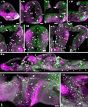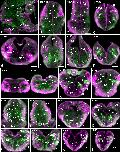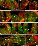 Supporting Figure 1 (Magentahyphen;green version of Figure 2 for the assistance of colorhyphen;blind readers): Photomicrographs of doublehyphen;labeled CB/CR sagittal (a, dorsal is upwards and rostral to the left) and transverse (bhyphen;t) sections through representative levels of the brain of Xenopus at embryonic stages (indicated on each photomicrograph).The levels of transverse sections are indicated in Figure 1a and b. In all photographs green is CB and red is CR, whereas yellow represents double labeled cells. Dashed lines mark the approximate boundary between neuromeres and telencephalic subdivisions. Arrowheads in f point to the lateral CRir fiber tract in p2, in h and s point to the lateral CRir fiber tract in the basal plate, and in q to doble labeled cells in the LDT. The asterisks in r and t mark the CBir fibers in the lateral rhombencephalon. For abbreviations, see list. A magentahyphen;green version of this figure is provided as Supporting Information Figure 1. Scale bar = 50 μm in ahyphen;h; 100 μm in ihyphen;t. |