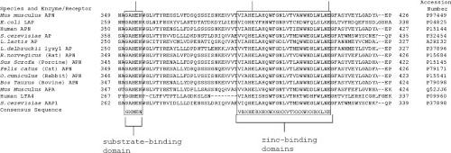 Figure 8. Sequence alignments of aminopeptidase family membersPotential homologues of mouse APN (P97449) were identified by a NCBI blastp search. Peptide sequences were aligned using COBALT (http://www.ncbi.nlm.nih.gov/tools/cobalt/cobalt.cgi?CMD=Web). Highly conserved regions are boxed. In the consensus sequence row, X is any amino acid and B is bulky side chain neutral amino acids. The full-length aligned sequence from E. coli LAP (not shown) was used as the basis for the homology modelling of mouse APN. The three conserved residues in the binding domains of murine APN selected for site-directed mutagenesis are indicated with a vertical line above them, a fourth mutated residue, Tyr476, is not shown. AAP1, alanine/arginine aminopeptidase 1; LTA4, leukotriene A-4 hydrolase.