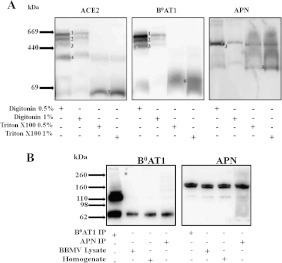 Figure 1. Isolation of intestinal brush-border protein complexesMurine intestinal BBMVs were prepared using MgCl2 precipitation and centrifugation. (A) BBMVs (50 μg/sample) at 1 mg/ml were solubilized in detergent buffer as indicated and mixed with Coomassie Brilliant Blue G-250 loading dye before separation. Samples were separated by Blue native PAGE. Following semi-dry transfer on to a PVDF membrane, individual proteins were detected by immunoblot analysis. The blot was stripped and re-probed for the proteins indicated, to allow a direct comparison of band positions. Protein complexes and individual proteins are numbered 1–7 (discussed in the main text). (B) Murine BBMVs were solubilized in co-immunoprecipitation buffer, followed by incubation with Protein A and primary antibodies against either B0AT1 or APN. After overnight incubation of BBMV samples, the cleared lysate and intestinal homogenate were separated by SDS/PAGE. Following semi-dry transfer on to a nitrocellulose membrane, the blots were pre-stripped using stripping buffer and blocked overnight to reduce background signal. Individual proteins were then detected as indicated above the blot and visualized using immunoblot analysis. Molecular masses are indicated to the left-hand side in kDa.
