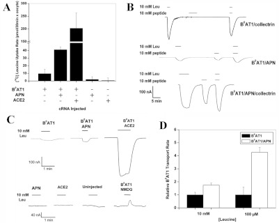 Figure 5. Mechanism of APN-mediated increase in substrate affinity of B0AT1Oocytes were injected with 10 ng of B0AT1 cRNA, 15 ng of APN cRNA and 2 ng of collectrin cRNA. (A) Oocytes were voltage clamped at −50 mV and subsequently superfused with either 200 μM leucine or 1 mM Leu-Ser-Lys-Leu tetrapeptide. Leucine-induced sodium currents were recorded 4–6 days post-injection. All Na+ currents were normalized to the sodium currents elicited by 200 μM leucine (ILeu) at 100%. Each bar represents the mean±S.D. (n=6–8, e=3). (B) Oocytes were recorded as indicated in (A) and superfused with either 200 μM leucine or 1 mM leucine tripeptide. All Na+ currents were normalized to the Na+ currents elicited by 200 μM leucine (ILeu) at 100%. Each bar represents the mean±S.D. (n=18).