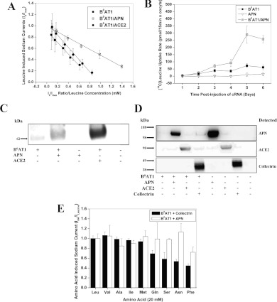 Figure 4. Changes in B0AT1 transporter kinetics by APN and ACE2Oocytes were injected with combinations of the following amounts of cRNA: B0AT1, 10 ng; APN, 15 ng; ACE2, 10 ng; and collectrin, 2 ng. Leucine-induced Na+ currents were recorded on day 5 post-injection, except those co-injected with B0AT1 and ACE2, which were recorded on day 3 or 4 post-injection. (A) Oocytes were voltage-clamped at −50 mV and subsequently superfused with serial concentrations of leucine (0.1–10 mM) in descending and then ascending order. B0AT1-expressing oocytes were not superfused with 0.1 mM leucine due to a low signal to noise ratio elicited at this concentration. An Eadie–Hofstee linear regression plot of the data points is shown. Each data point represents the mean±S.D. (n=6–8, e=3). (B) Uptake of 100 μM [14C]leucine was measured over 15 min on days 1–6 post-injection. Oocyte endogenous [14C]leucine uptake has been subtracted. Each data point represents the mean±S.D. (n=8–12, e=3). (C) A total of 15 oocytes per sample were incubated in 0.5 mg/ml sulfo-NHS-LC-biotin on day 5 post-injection before being lysed and treated with streptavadin-coated agarose beads. Samples were separated by SDS/PAGE, blotted, detected and visualized for B0AT1 using immunoblot analysis. (D) A total of 15 oocytes per sample were prepared as in (C). Following SDS/PAGE, proteins were detected and visualized using immunoblot analysis for APN. Membranes were prepared for detection of subsequent proteins by stripping, re-blocking and re-probing of the protein indicated. Molecular masses are indicated to the left-hand side in kDa. (E) Oocytes were voltage-clamped at −50 mV and subsequently superfused with 20 mM of the amino acid (AA) indicated. All substrate-induced currents were normalized to a 20 mM leucine current (ILeu) to account for transporter de-sensitization. Each bar represents the mean±S.D. (n=6–8, e=3).