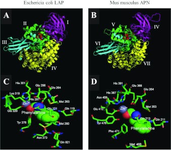 Figure 7. Homology model of mouse APNThe homology model of mouse APN was generated using HHpred Homology detection and structure prediction tool (Max-Planck Institute for Developmental Biology; http://toolkit.tuebingen.mpg.de/hhpred) and visualized using PyMOL v9.9 (DeLano Scientific; http://www.pymol.org). Depicted are E. coli LAP (PDB code 3B34) (A) and murine APN (B) with phenylalanine bound to their active site. The top panels display a lateral three-dimensional view of the murine and E. coli structures. Domains are shaded as follows: magenta (domain I for E. coli, domain IV for mouse); green (domain II for E. coli, domain V for mouse); cyan (domain III for E. coli, domain VI for mouse); and yellow (domain IV for E. coli, domain VII for mouse). Domains I–III from mouse APN are not depicted (residues 1 to 89) as no homologous sequence exists in E. coli for these. The HEXXH……….BXLXE and GXMEN consensus sequences for zinc and amino acid binding are shaded red and orange respectively. The zinc ion is shaded blue-grey. The active sites of E. coli LAP and murine APN are depicted in panels (C) and (D) respectively. The zinc ion is shaded blue-grey, and the bound phenylalanine is depicted as a space-filled model, with oxygen and nitrogen atoms coloured red and blue respectively. All residues predicted to bind and interact with the substrate are shown and labelled.