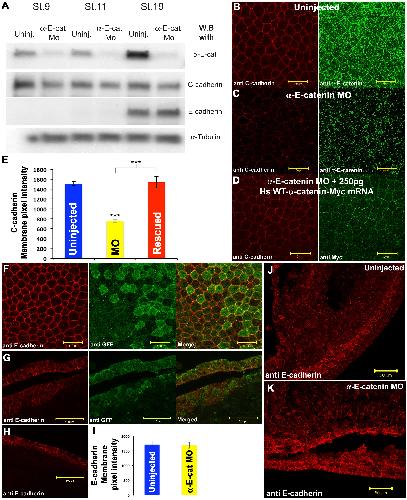 (A) Western blot showing the level of αEC, C-cadherin, and E-cadherin protein levels in uninjected and αEC-MO-injected embryos at st.9,11, and 19.(B-D) Confocal projections of the non-neural ectoderm of wild type (B) or αEC-depleted (C) st. 19 embryos, stained for C-cadherin (Red) and αEC (Green), and rescue of C-cadherin (Red) junctional localization by the introduction of Myc-tagged (green), human wild type αEC (D). (E) Quantification of pixel intensity for C-cadherin levels. (F) E-cadherin (Red) junctional localization in αEC-depleted cells (Green, GFP) in the non-neural ectoderm. (G-H) Cross sections of αEC-depleted (G), or uninjected (H) embryos, stained for E-cadherin (Red) and GFP (green). (I) Quantification of pixel intensity for E-cadherin levels. (J-K) Wholemount vibratome sections stained for E-cadherin in wildtype (J) or αEC-depleted (K) embryos. Scale bars in B-D, F, J-K 50 , G-H 100 . |