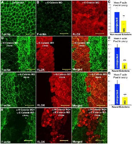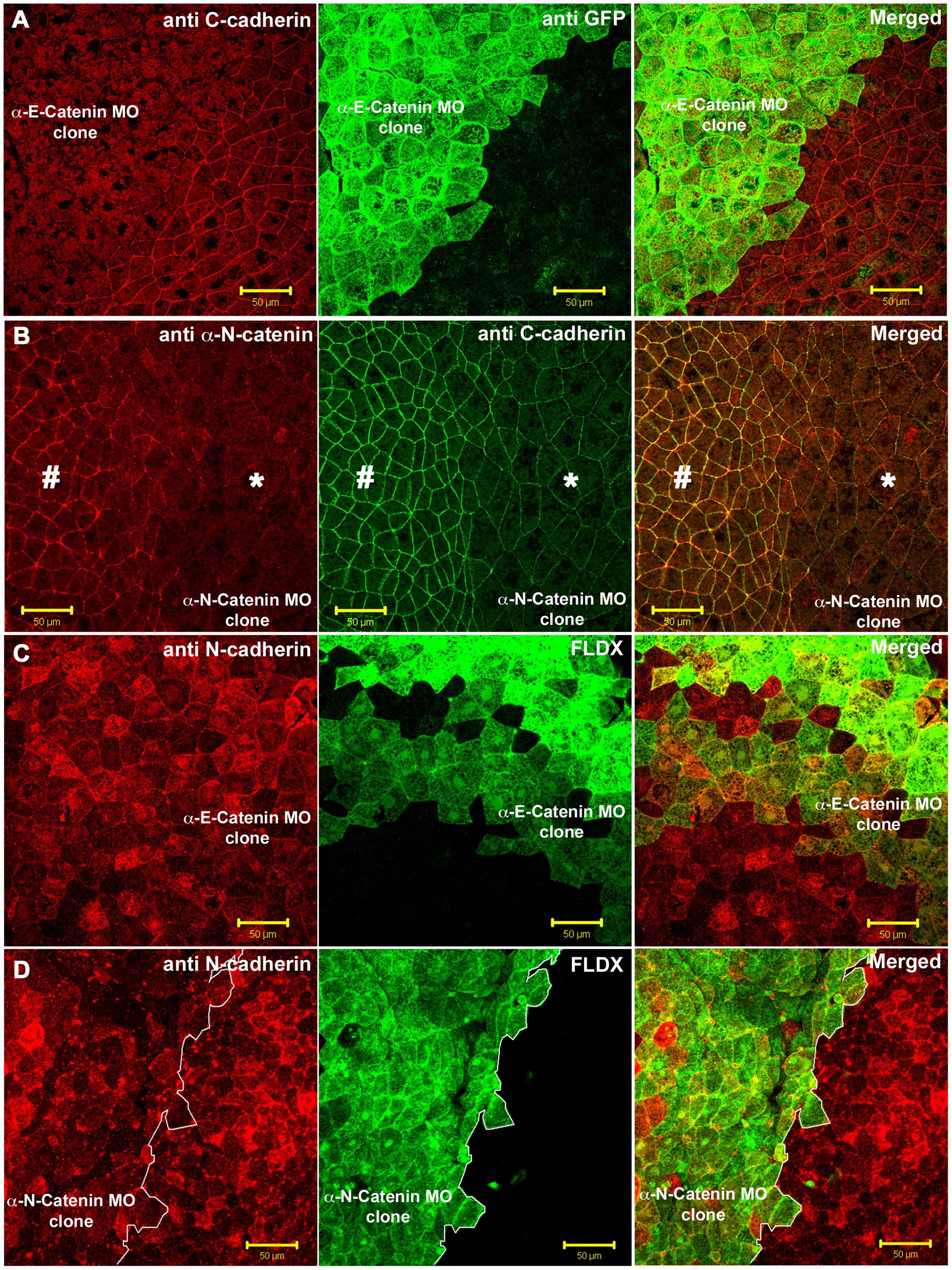 (A) Neural plates containing αEC-depleted clones (green) stained for C-cadherin (Red) and GFP (Green). (B) Neural plates containing αNC-depleted clones (morpholino-injected side marked by *, and uninjected side marked by # ), stained for αNC (Red) and C-cadherin (Green). (C) αEC-depleted neural plate cells (Green, FLDX) stained for N-cadherin (Red). (D) αNC-depleted neural plate cells (Green, FLDX) stained for N-cadherin (Red). Scale bars in A-D, 50 . |