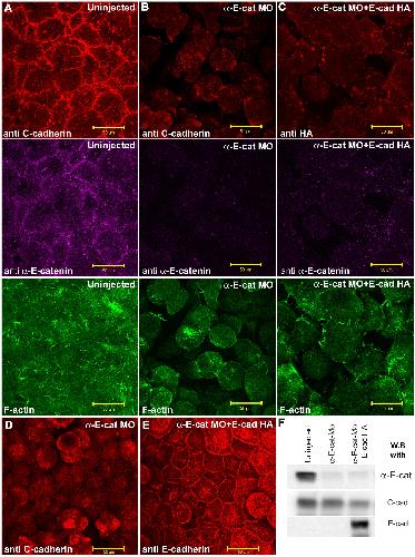 (A-C) Blastocelic roof cells of st. 9 animal caps stained for C-cadherin (red in A and B), or E-cadherin-HA (red in C), αEC (purple), and F-actin (green) in uninjected (A), αEC-depleted (B), or αEC + E-cadherin-HA mRNA injected (C) embryos. (D-E) Superficial cells imaged from the blastocelic cavity in animal caps where all the deeper cells have fallen off, stained for C-cadherin in (D), or E-cadherin (E), in αEC depleted (D), or αEC depleted + E-cadherin-HA mRNA-injected (E) embryos. (F) Western blot data showing the depletion of αEC protein and the expression of C-, and E-, cadherin protein levels in the experiment. Scale bars, 50 . |