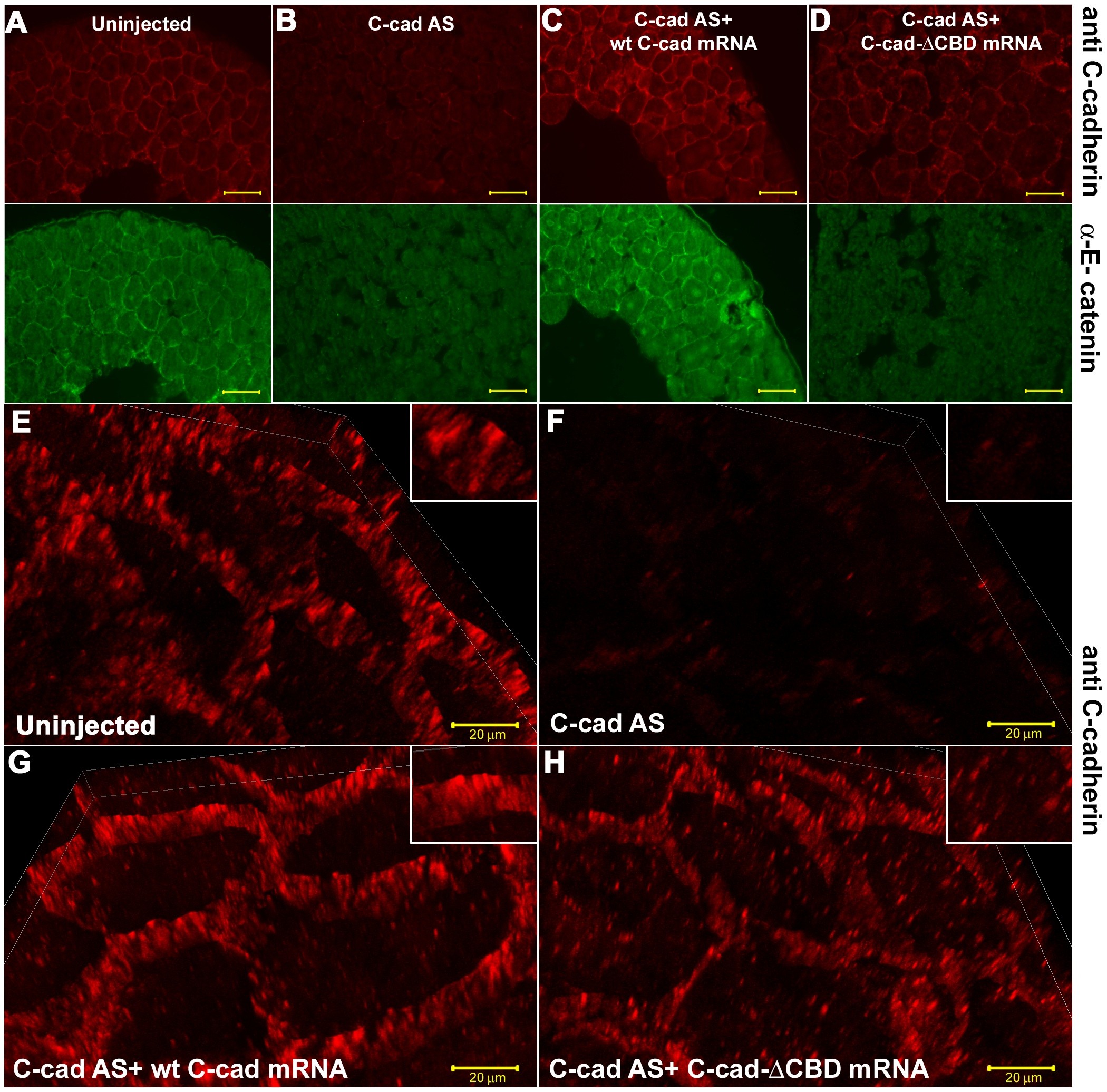 ) Immunostaining for C-cadherin (upper panels) and αEC (lower panels) in paraffin sections of stage 9 embryos, showing the non-rescue of cell adhesion in the absence of the CBD. (E) 3D projections of high magnification, and high resolution confocal images showing the localization of C-cadherin protein. Scale bars for A-D, 50 , E-H, 20 . |