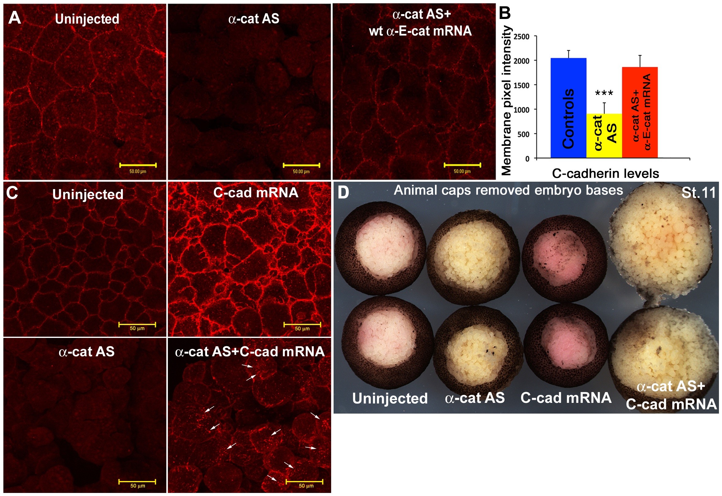 (A) Immunostaining of animal caps stained for C-cadherin, showing that the loss of C-cadherin junctional localization caused by αEC depletion can be rescued by the expression of wild type αEC mRNA.(B) Quantification of cell junction-localized C-cadherin levels. (C) Immunostaining of animal caps stained for C-cadherin, showing that the loss of C-cadherin junctional localization caused by αEC depletion cannot be fully rescued by the injection of C-cadherin mRNA.(D) Wound healing assay of embryos in which the animal caps have been dissected out and healed for 1 hr in 1MR, showing the increased negative effect of both α-catenin depletion and C-cadherin over-expression. Scale bars in A, C 50 . |