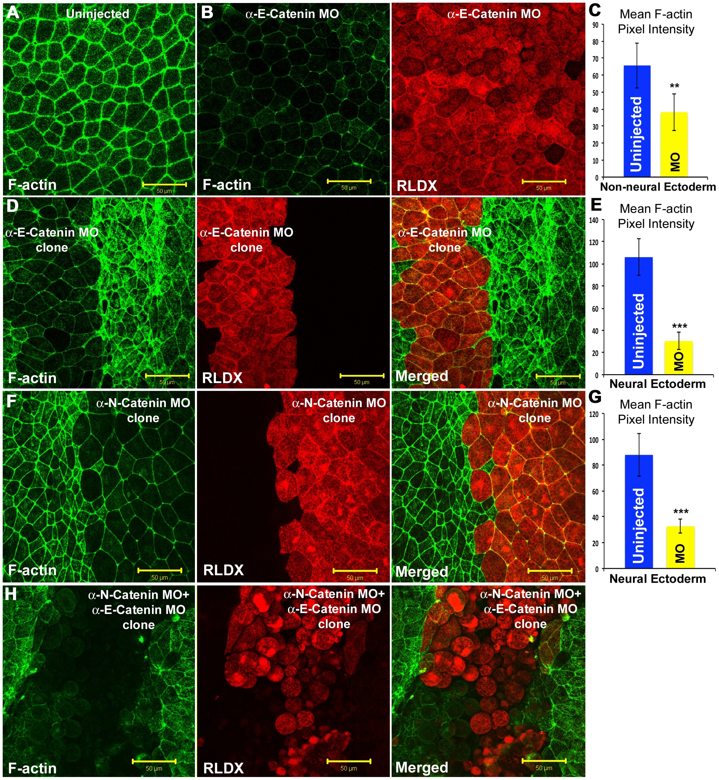 (A) Alexa-488 phalloidin staining for F-actin (green) in uninjected non-neural ectoderm cells. (B) αEC morpholino-injected non-neural ectoderm cells (Red, RLDX) showing the loss of F-actin (green). (C) Mean F-actin pixel intensity quantitation in uninjected and αEC-depleted non-neural ectoderm cells. (D) F-actin staining (green) in αEC-depleted neural ectoderm cells (Red). (E) Mean F-actin pixel intensity quantitation in uninjected and αEC-depleted neural ectoderm cells. (F) F-actin staining (green) in αNC-depleted neural ectoderm cells (Red). (G) Mean F-actin pixel intensity quantitation in uninjected and αNC-depleted neural ectoderm cells. (H) Neural plates stained for F-actin (green) in αEC, and αNC-depleted neural ectoderm cells (red). Scale bars, 50 . |