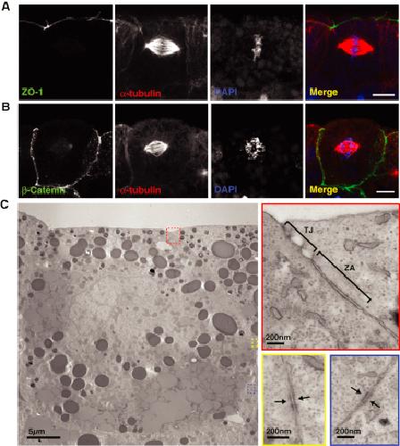 Figure 2. Spindle Position Does Not Correspond to Cell-Cell Junction Location(A) Immunofluorescence for ZO-1 (green), a component of tight junctions, shows that spindle position does not correlate with the location of tight junctions.(B) β-Catenin (green), a component of adherens junctions, is localized all around the basolateral cell surfaces.(C) Transmission electron micrographs (zoomed-in areas highlighted in red, yellow, and blue boxes) show that tight junctions (TJ) and the zona adherens (ZA) are located apically and stretch no more than 2.5 μm down from the apical cell membrane (red box), whereas regions of high density, which may be cell-cell contacts (yellow and blue boxes; arrows), are found at random positions around the basolateral membranes.Scale bars represent 10 μm in (A) and (B) and are as displayed in (C). |