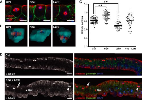 Figure 4. Disruption of Astral Microtubules and Actin Filaments Has Contrary Effects on Spindle Position(A) Side-view immunofluorescent images of spindles in control (Ctrl), Noc, and LatB-treated embryos. Treatment with low-dose Noc causes spindles to move toward the apical cell surface, whereas spindles in LatB-treated embryos move toward the basal surface.(B) 3D reconstructions of individual cells from the epithelium of Ctrl, Noc, and LatB embryos.(C) Quantification of spindle position in Ctrl, Noc, LatB, and Noc + LatB-treated embryos; each dot represents the position of a single spindle. Note that in double-treated embryos the spread of spindle position data are much greater than in either single treatments or control. For significance testing, unpaired Student's t tests were performed (n = 3 independent experiments, from a total of 19, 18, 16, and 16 embryos for Ctrl, Noc, LatB, and Noc + LatB, respectively; ââp < 0.01).(D) Immunofluorescence images of Ctrl and Noc + LatB-treated embryos. In double-treated embryos, spindles are seen randomly positioned along the apicobasal axis, with spindles seen at the apical surface (arrow), basal surface (arrowhead), and center of the cell (double arrow).Scale bars represent 20 μm. See also Figure S2. |