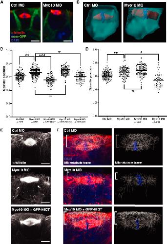 Figure 5. Myo10 Helps Position the Spindle but Functions Antagonistically to F-Actin(A) Side-view immunofluorescent images of spindles in control morpholino (Ctrl MO) and Myo10 MO-injected embryos.(B) 3D reconstructions of single cells from epithelium of Ctrl MO and Myo10 MO embryos.(C) Quantification of spindle position in Ctrl MO, Myo10 MO (both coinjected with GFP as a control), and Myo10 MO rescued with full-length GFP-tagged Myo10 (GFP-HIQT), tailless Myo10 (GFP-HIQCC), or headless Myo10 (GFP-IQT). Spindles are repositioned closer to the apical cell surface in Myo10 MO embryos compared to Ctrl MO, a phenotype rescued by coinjection with full-length or headless Myo10, but not tailless Myo10. To test for significance, unpaired Student's t tests were performed (n = 5 independent experiments for Ctrl MO + GFP and Myo10 MO + GFP, from a total of 27 and 32 embryos, respectively; n = 3 independent experiments, from a total of 18 embryos each for Myo10 MO + GFP-HIQT, + GFP-HIQCC, and + GFP-IQT; âp < 0.05, ââp < 0.01, âââp < 0.01).(D) Quantification of spindle position in Ctrl MO, Myo10 MO (both treated with 0.1% DMSO as a control), and Myo10 embryos treated with Noc or LatB. Treatment with low-dose Noc does not affect Myo10 MO spindle position, but LatB treatment of Myo10 MO embryos causes spindles, on average, to move basally and results in a wider spread of spindle position. To test for significance, unpaired Student's t tests were performed (n = 3 independent experiments, from a total of 20, 16, 18, and 11 embryos for Ctrl MO, Myo10 MO, Myo10 MO + Noc, and Myo10 MO + LatB, respectively; âp < 0.05, ââp < 0.01).(E) High-resolution side-view confocal images (stacks of 13 z slices for each condition) of spindle microtubules in Ctrl MO, Myo10 MO, and Myo10 MO rescued with GFP-HIQT. In Ctrl MO cells, spindle microtubules have an apical asymmetry, with more astral microtubules on the apical side (arrows). Spindles in Myo10 MO cells lose this asymmetry, and long basal astral microtubules are seen (arrows). The GFP-HIQT rescue restores the apical asymmetry.(F) Filament tracing of the microtubule signal (white trace of red staining) provides an unbiased approach to view the asymmetry of the microtubule network. For each image, the trace represents only microtubules present in the central mitotic cell: any traces originating in neighboring cells were deleted. In particular, a dense network of microtubules is seen on the apical side of Ctrl MO spindles, which is lost in the Myo10 MO and restored in the GFP-HIQT rescue (square bracket).ns, not significant. Scale bars represent 10 μm. See also Figure S3. |