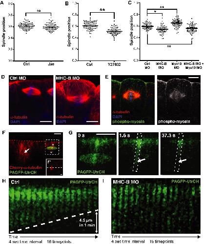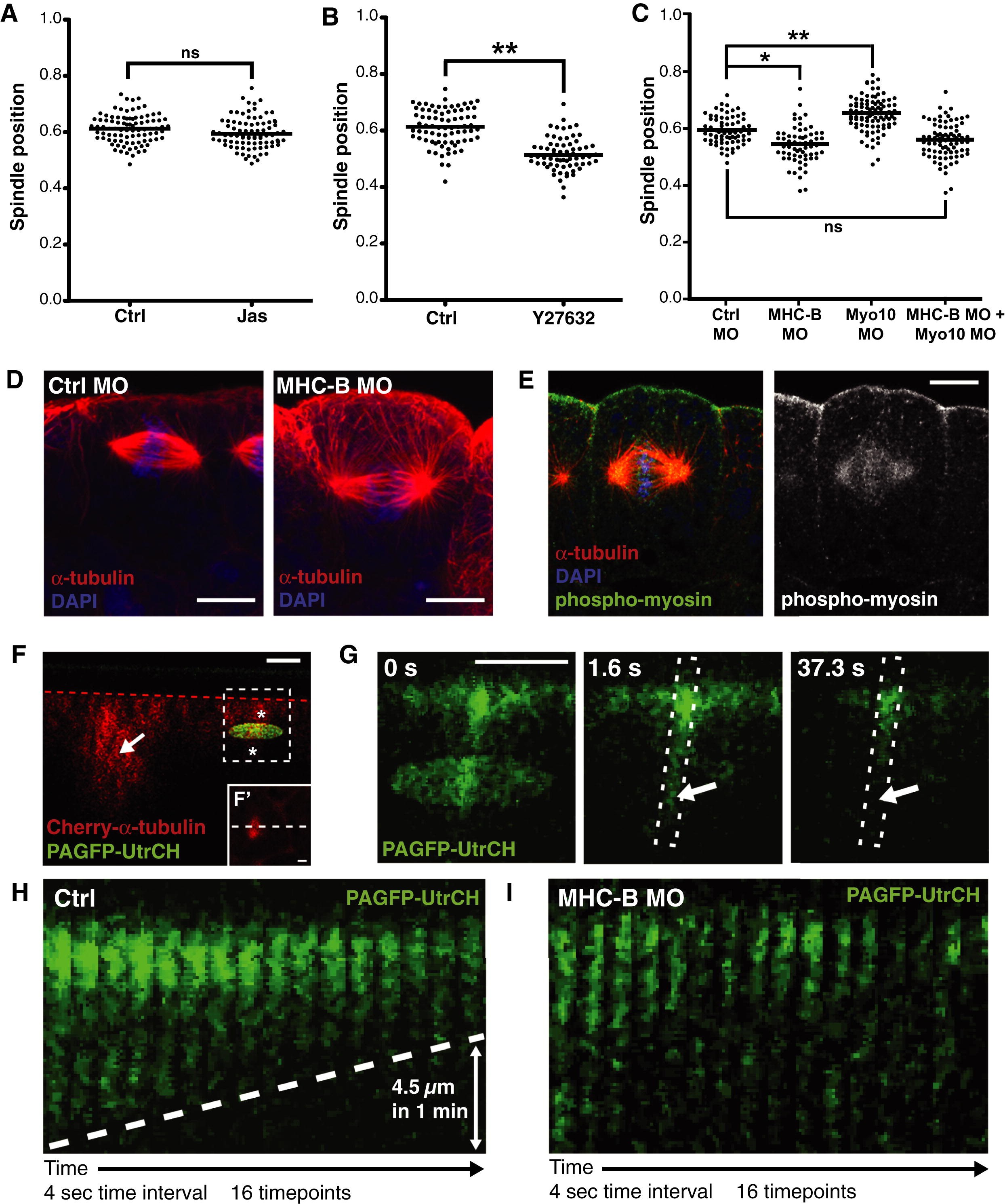 Figure 6. Myosin-2 Functions with F-Actin to Position the Spindle(A) Quantification of spindle position in control (Ctrl) and Jas-treated embryos indicates no effect on spindle position when F-actin turnover is disrupted. ns, not significant.(B) Inhibition of myosin-2 by the Rho kinase inhibitor, Y27632, causes spindles to position closer to the basal surface, compared to controls (∗∗p < 0.01).(C) Knockdown of myosin-2 function using a morpholino against myosin heavy-chain B (MHC-B MO) also causes spindles to position more basally compared to controls (Ctrl MO). Double knockdown of myosin-2 and Myo10 rescues the effects seen in single knockdowns, and spindles are positioned as in controls. To test for significance, unpaired Student's t tests were performed (in B, n = 4 independent experiments, from a total of 20 and 30 embryos for Ctrl and Y27632, respectively; in C, n = 3 independent experiments, from a total of 21 embryos for Ctrl MO, MHC-MO, and Myo10 MO, and 20 embryos for MHC-B MO + Myo10 MO; ∗p < 0.05, ∗∗p < 0.01). ns, not significant.(D) Confocal images of spindles in Ctrl MO and MHC-B MO embryos; note the basal position of the MHC-B MO spindle.(E) Staining for active myosin-2 (phospho-myosin; green) shows a strong accumulation apically, trailing off on the lateral sides in a basal direction.(F) To test for an apically directed cortical flow of actin filaments, photoactivatable-GFP fused to the GFP-UtrCH probe (PAGFP-UtrCH) was used (green). Cherry-α-tubulin (red) was coexpressed to identify mitotic cells, which were imaged in z (F′ shows an x/y image of the cell in F; white dashed line indicates the line of cross-section for F), and a zone of photoactivation (green oval) was positioned across the cell cortex (asterisks) approximately 5 μm down from apical cell surface (indicated by red dashed line).(G) A zoom-in of the region indicated by dashed box in (F); photoactivation causes an accumulation of fluorescence apical of the zone of photoactivation. To assess any movement of F-actin, we followed the loss of fluorescence that occurs once photoactivation is stopped. We saw progressive loss from basal to apical (arrows) over time, suggesting an apical-ward movement of F-actin.(H) Kymographs (of boxed region in G) show the progressive loss of fluorescence from basal to apical, the gradient of which (dashed line) can be used to estimate the speed of F-actin movement. In this case, the fluorescence front receded apically by 4.5 μm in 1 min.(I) Knockdown of myosin-2 function (MHC-B MO) stops the directional loss of fluorescence, indicating stalled F-actin movement. Four control embryos and three MHC-MO injected embryos were analyzed, with similar results.Scale bars represent 10 μm in (D) and (E) and 5μm in (F), (F′), and (G); time stamps indicate time in seconds. See also Figure S4 and Movies S5 and S6. |