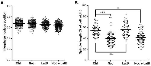 Figure S2, related to Figure 4: (A) Interphase nuclei position was quantified in Control, Noc, LatB and Noc + LatB treatments. Position was measured relative to cell length. No significant difference in interphase nuclei position was see in any of the treatments. (B) Metaphase spindle length was measured in Control, Noc, LatB and Noc + LatB treatments. Spindle length was measured relative to cell width. Spindles in embryos treated with Noc were found to be significantly shorter when compared to controls. To test for significance, unpaired Student t-tests were performed (n=3 independent experiments from a total of 18, 18, 16, 17, embryos for Ctrl, Noc, LatB and Noc + LatB respectively; *p<0.05, ***p<0.001). |