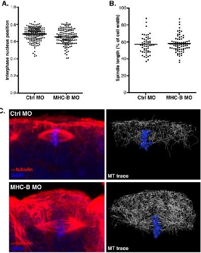 Figure S4, related to Figure 6: (A) Quantification of interphase nuclei position in Control MO and MHC-B MO injected embryos. Nuclei position was measured relative to cell length. No significant difference in nuclei position was seen. (B) Quantification of metaphase spindle length in Ctrl and MHC-B MO injected embryos, measured relative to cell width. No significant difference in spindle length was seen. (C) Microtubule organisation following knockdown of myosin-2. Z-stack (left; -tubulin in red, DAPI staining in blue) and microtubule trace (right; trace in white; chromosomes reconstructed in blue) images of Control and MHC-B MO cells. Knockdown of myosin-2 leads to an expansion of the dense microtubule network apical of the spindle. To test for statistical significance in (A) and (B), unpaired Student t-tests were performed (n=3 independent experiments from a total of 21 and 25 embryos for Ctrl MO and MHC-B MO, respectively). |