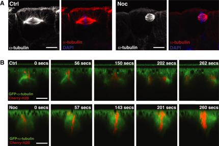 Figure 3. Treatment with Low-Dose Noc Specifically Disrupts Astral Microtubules and Causes Spindles to Reposition Apically(A) Spindles in control (Ctrl) versus Noc-treated embryos; treatment with Noc eradicates astral microtubules that are seen in Ctrl spindles and causes spindles to move to the apical cell surface.(B) Stills taken from Movie S3, showing spindles in Ctrl and Noc-treated embryos. The Noc-treated spindle moves toward the apical cell surface, whereas the Ctrl spindle remains in a constant position along the apicobasal axis even as anaphase proceeds.Scale bars represent 10 μm. See also Figure S1 and Movies S3 and S4. |