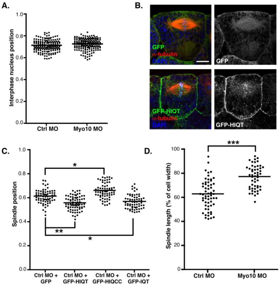Figure S3, related to Figure 5: (A) Quantification of interphase nuclei position in Control MO and Myo10 MO injected embryos. Nuclei position was measured relative to cell length. No significant difference in nuclei position was seen (an unpaired Student t-test was performed; n=3 independent experiments from a total of 21 embryos for Ctrl MO and Myo10 MO). (B) To determine Myo10 localisation, embryos were injected with GFP or GFP-HIQT (full length Myo10 tagged with GFP) and stained using an anti-GFP antibody (green). GFP-HIQT localises to the spindle and shows strong accumulation at the cell cortex. (C) Quantification of spindle position following over-expression of Myo10 constructs. In a control background, expression of GFP-HIQT causes spindles to reposition slightly basally, as does expression of GFP-IQT. Whereas, expression of GFP-HIQCC causes spindles to reposition slightly apically when compared to controls. To test for significance, unpaired Student t-tests were performed (n=3 independent experiments, from a total of 20, 19, 18, and 16 embryos each for Ctrl MO + GFP, + GFP-HIQT + GFP-HIQCC and + GFP-IQT, respectively; *p<0.05, **p<0.01). (D) Quantification of metaphase spindle length in Ctrl and Myo10 MO injected embryos, measured relative to cell width. Spindles in Myo10 morphants are significantly longer than controls (an unpaired Student t-test was performed; n=3 independent experiments from a total of 21 embryos for Ctrl MO and Myo10 MO, ***p<0.001). |