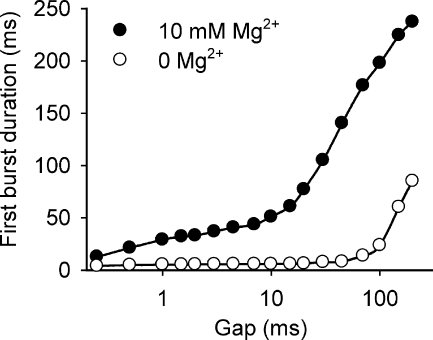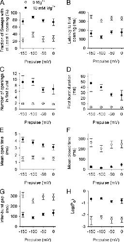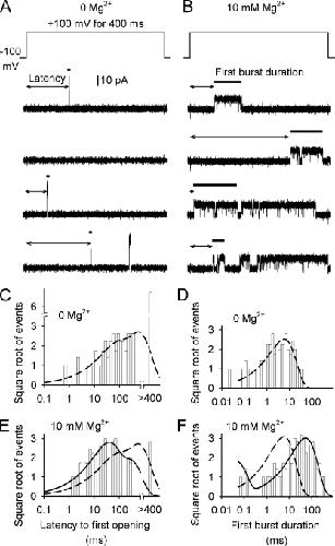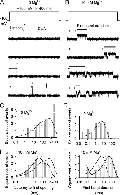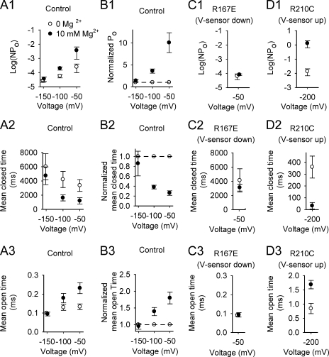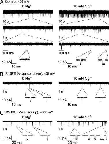BK channels are activated by intracellular Ca(2+) and Mg(2+) as well as by depolarization. Such activation is possible because each of the four subunits has two high-affinity Ca(2+) sites, one low-affinity Mg(2+) site, and a voltage sensor. This study further investigates the mechanism of Mg(2+) activation by using single-channel recording to determine separately the action of Mg(2+) on the open and closed states of the channel. To limit Mg(2+) action to the Mg(2+) sites, the two high-affinity Ca(2+) sites are disabled by mutation. When the voltage is stepped from negative holding potentials to +100 mV, we find that 10 mM Mg(2+) decreases the mean closed latency to the first channel opening 2.1-fold, decreases the mean closed interval duration 8.7-fold, increases mean burst duration 10.1-fold, increases the number of openings per burst 4.4-fold, and increases mean open interval duration 2.3-fold. Hence, Mg(2+) can bind to closed BK channels, increasing their opening rates, and to open BK channels, decreasing their closing rates. To explore the relationship between Mg(2+) action and voltage sensor activation, we record single-channel activity in macropatches containing hundreds of channels. Open probability (P(o)) is dramatically increased by 10 mM Mg(2+) when voltage sensors are activated with either depolarization or the mutation R210C. The increased P(o) arises from large decreases in mean closed interval durations and moderate increases in mean open interval durations. In contrast, 10 mM Mg(2+) has no detectable effects on P(o) or interval durations when voltage sensors are deactivated with very negative potentials or the mutation R167E. These observations are consistent with a model in which Mg(2+) can bind to and alter the gating of both closed and open states to increase P(o), provided that one or more voltage sensors are activated.