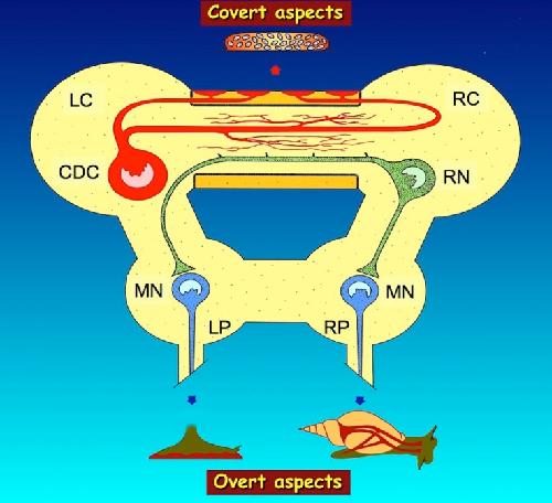 Figure 1. Summarizing scheme of the regulation by the caudodorsal cells (CDC) of Lymnaea stagnalis of overt (visible) and covert (invisible) aspects of egg-laying behavior by, respectively, neurohemal peptide release from axon terminals in the periphery of the cerebral commissure and non-synaptic peptide release from axon collaterals in the inner part of the commissure. Overt aspects include the activation of muscles in the foot for locomotion during substrate cleaning (bottom left) and of muscles attached to the shell for shell turning (bottom right), while covert aspects include the induction of ovulation and the activation of accessory sex glands to produce an egg mass (top). For details on these aspects, see text. LC, left cerebral ganglion; LP, left pedal ganglion; MN, motor neurons; RC, right cerebral ganglion; RN, Ring neuron; RP, right pedal ganglion. |