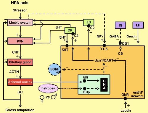 Figure 3. Model of interactions between the npEW and the HPA-axis and other centers involved in stress adaptation and energy metabolism. Continuous lines indicate established interactions, dashed lines indicate presumed interactions; the dotted line refers to sex difference. 5HT, serotonin; ACTH, adrenocorticotrope hormone; BDNF, brain-derived neurotrophic factor; C2, corticotropin-releasing factor receptor 2; CART, cocaine- and amphetamine-regulated transcript peptide; CB, endocannabinoids; CB1, endocannabinoid receptor 1; CRF, corticotropin-releasing factor; DR, dorsal raphe nucleus; ERβ, estrogen receptor β; GABA, γ-aminobutyric acid; GC, glucocorticoids; GR, glucocorticoid receptor; IN, interneuron; LH, lateral hypothalamus; LS, lateral septum; NPY, neuropeptide Y; ObR, leptin receptor; PVN, paraventricular nucleus; Ucn1, urocortin 1; Y-1/5; neuropeptide Y receptors 1 and 5. (Slightly modified after Derks, 2010.) |