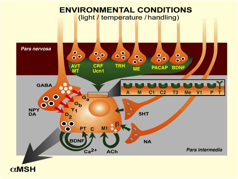 Figure 2. Transduction of various physiological environmental stimuli to the melanotrope cell of Xenopus laevis controlling the secretion of αMSH, via neurohemal nerve terminals in the pars nervosa and from synaptic terminals in the pars intermedia of the pituitary gland. 5HT, 5-hydroxytryptamine (serotonin); A, arginine-vasopressin receptor; ACh, acetylcholine; AVT, arginine-vasopressin; β, β-adrenergic receptor; BDNF, brain-derived neurotrophic factor; C, calcium-sensing receptor; C1, corticotropin-releasing factor receptor 1; C2, corticotropin-releasing factor receptor 2; Ca2+, calcium ion; CRF, corticotropin-releasing factor; D2, dopamine D2 receptor; DA, dopamine; Ga, GABAA receptor; Gb, GABAB receptor; GABA, γ-aminobutyric acid; M, mesotocin receptor; M1, muscarinic M1 receptor; ME, metenkephalin; Me, metenkephalin receptor; MT, mesotocin; NA, noradrenalin; NPY, neuropeptide Y; P, P75NTR receptor; PACAP, pituitary adenylyl cyclase-activating polypeptide; T, TrkB receptor; T3, thyrotropin-releasing hormone receptor 3; TRH, thyrotropin-releasing hormone; Ucn1, urocortin 1; V1, VPAC1 receptor; Y1, NPY Y1 receptor. (Modified after Roubos et al., 2005.) |